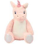 100% polyester. Soft plush pink unicorn. Pink contrast horn and feet. White contrast mane and tail. White coloured panel on tummy. Sewn eyes. Removable inner pad. Zip access for decoration onto front panel. Suitable for embroidery, print and sublimation.